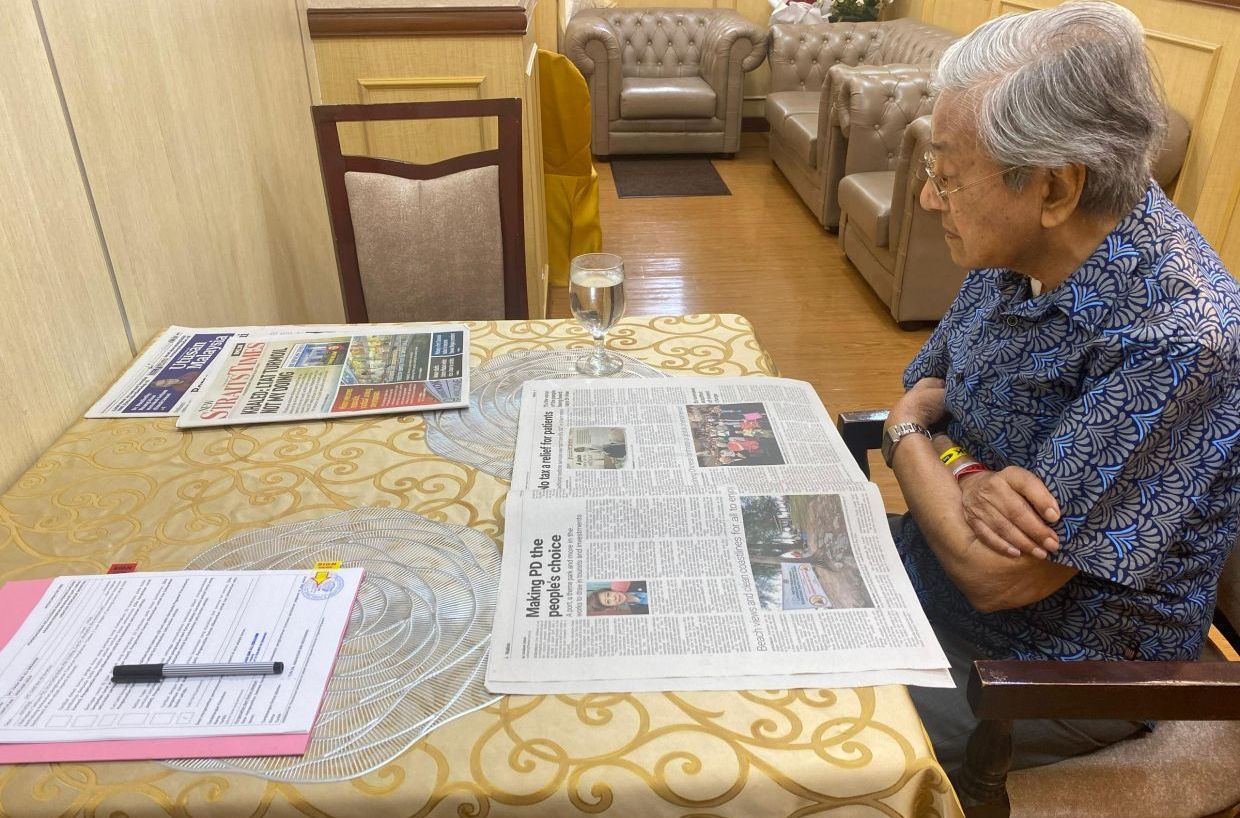 In the photos, the 98-year-old was seen reading today’s newspapers and doing some writing.