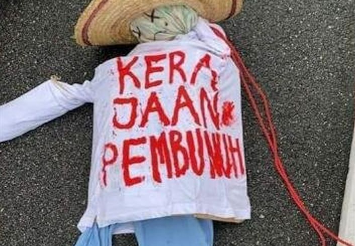 A photo of the figurine showed it clad in a white T-shirt with blue pants and a straw hat. The words “Kerajaan Pembunuh” were written on its shirt in red.
