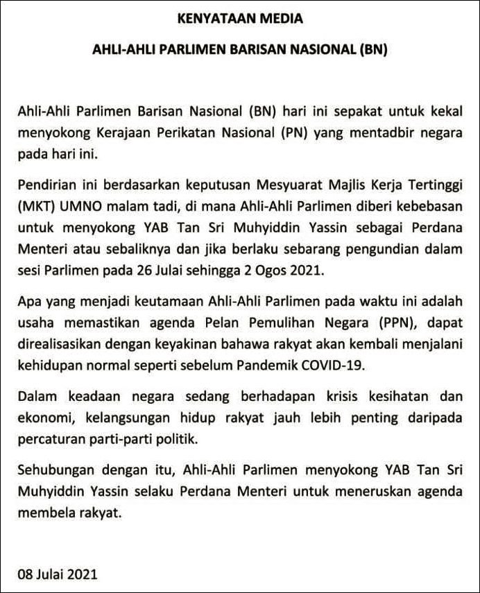 However, according to the statement that was confirmed authentic by an aide to new deputy prime minister Ismail Sabri Yaakob, the MPs from BN would not only continue to support Muhyiddin but the Perikatan Nasional-led government as well.