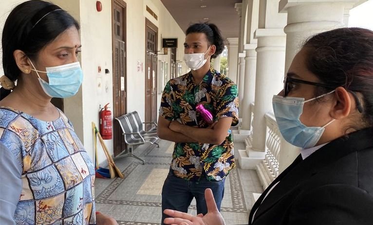 T Nhaveen’s mother Shanti Dorairaj, 47, (left) talking to their lawyer P Malkit Kaur (right), while Nhaveen’s friend T Previin looks on.