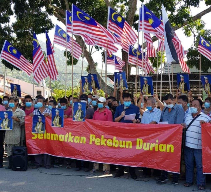 Meanwhile, some 200 durian farmers gathered in front of the Sungai Klau market today, urging the Yang di-Pertuan Agong Al-Sultan Abdullah Ri’ayatuddin Al-Mustafa Billah Shah, who is also the Sultan of Pahang, to assist them in the land matter.