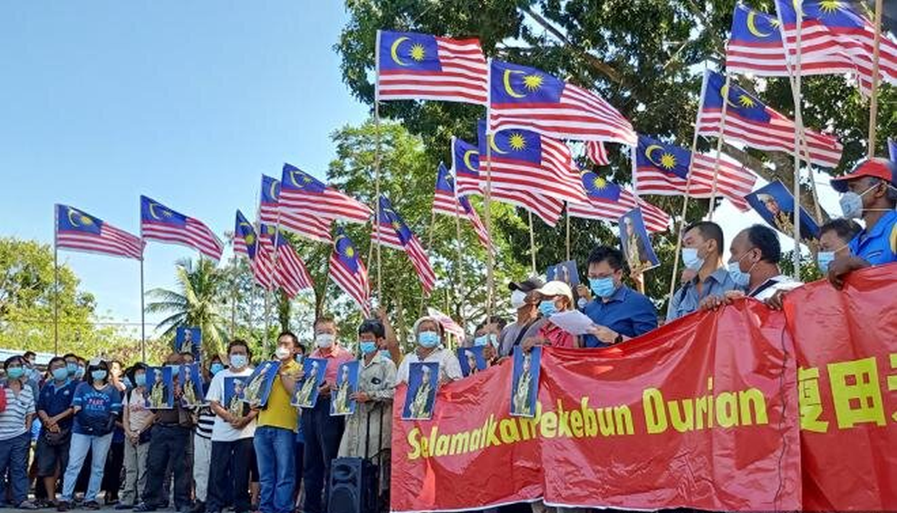 Holding photos of Yang di-Pertuan Agong Sultan Abdullah Ahmad Shah and chanting “save the durian farms”, the farmers urged the king, who is also the sultan of Pahang, to intervene in the land dispute.