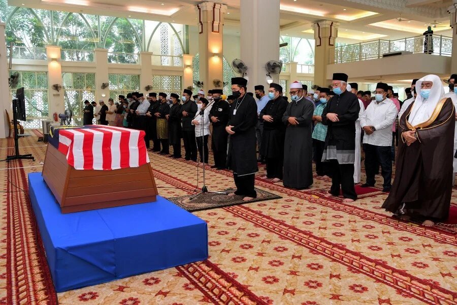 The remains were bathed and wrapped in shroud at the mosque before the public was allowed to pay their last respects from 9am to 1pm and were to be later brought to the National Mosque for the state funeral.