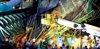 A low-loader trailer crashed heavily into the overhead scaffolding used for constructing the Sungai BesiāUlu Klang Elevated Expressway.