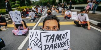 Hundreds of Malaysian youths gathered for a sit-in protest, calling for Parliament to immediately reconvene and the end of the state of Emergency, yesterday.